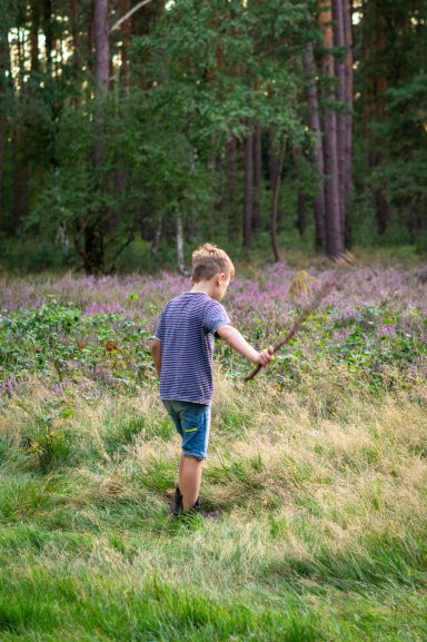 Auf einer weißen Picknickdecke, inmitten der lila blühenden Heide sitzen zwei Menschen und beobachten lächelnd ihre tobenden Kinder. Der Sandweg, der an der Heide entlang führt ist das perfekte Spielfeld für Stockkämpfe und Fußballspiele. Die Sonne verschwindet langsam hinter den großen Kiefern und in diesem Moment fühlt sich der Alltag ganz weit weg an.